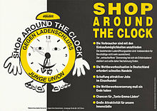 Das erste für die Arbeitnehmer/innen freundliche Ladenöffnungszeitgesetz trat für neun Monate zwischen 1956 und 1957 in Kraft. Also von Montag bis Freitag 7 bis 18:30 Uhr und Samstag bis 14 Uhr. Sonntag galt generell als Ruhetag. Erst ab Ende der 1980er und Mitte der 1990er wurden die Ladenöffnungszeiten mehr und mehr zur Glorifizierung des Kapitalismus liberalisiert. In 1996 hatte die junge Union sogar für eine Abschaffung der Ladenöffnungszeiten geworben.