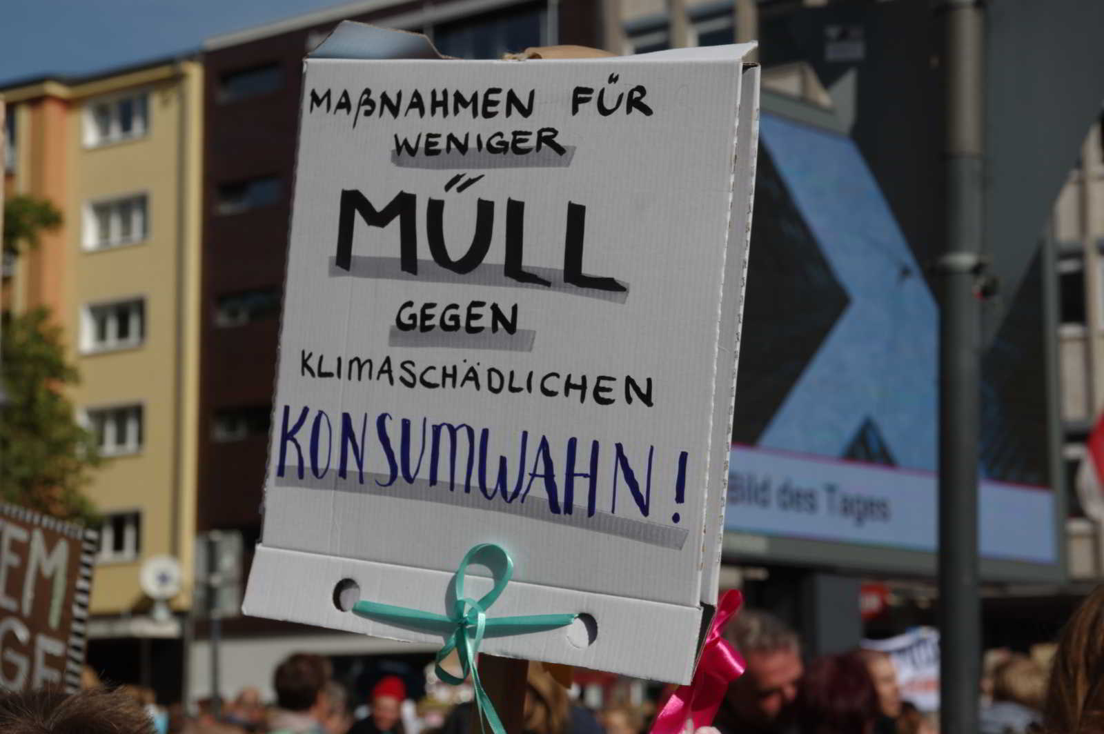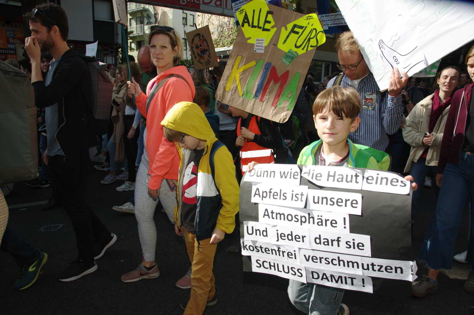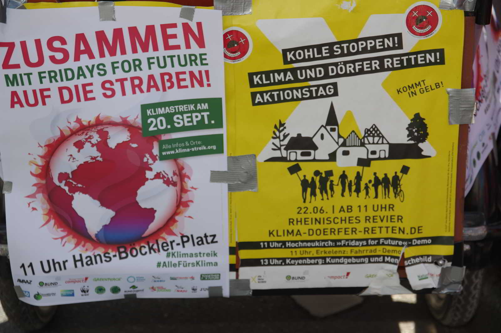 Zahlreiche Plakate und Banners zeigten die Slogans: „Klimawandel = tödlich, schnelles wirksames + verbindliches Handeln ist nötig“ oder „Maßnahmen für weniger Müll gegen klimaschädlichen Konsumwahn!“ oder etwas Lokales „Kohle stoppen! Klima und Dörfer retten!“ oder auch noch „Plastikverbot statt Artentot“ und „Die Klimakrise ist kein Märchen“ sowie viele anderen.